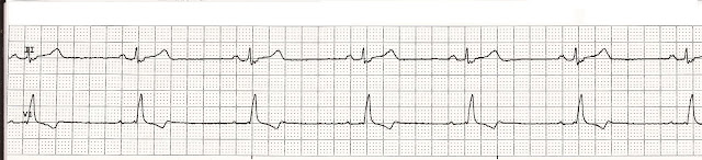 The rhythm is regular with a rate of 75/min. No P waves or ectopic beats are seen. A ventricular pacing stimulus is seen before each QRS complex. PR: ---, QRS: .16 sec, QT: .44 sec.