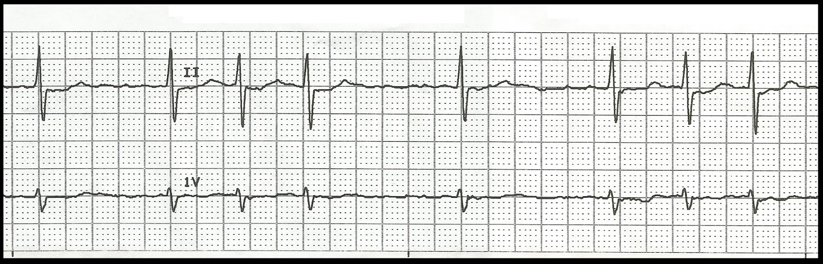 The rhythm is irregular due to the PVC. The rate is 110/min. There are upright P waves that precede each QRS complex. A single PVC is present. PR: .16 sec, QRS: .16 sec, QT: .36 sec.